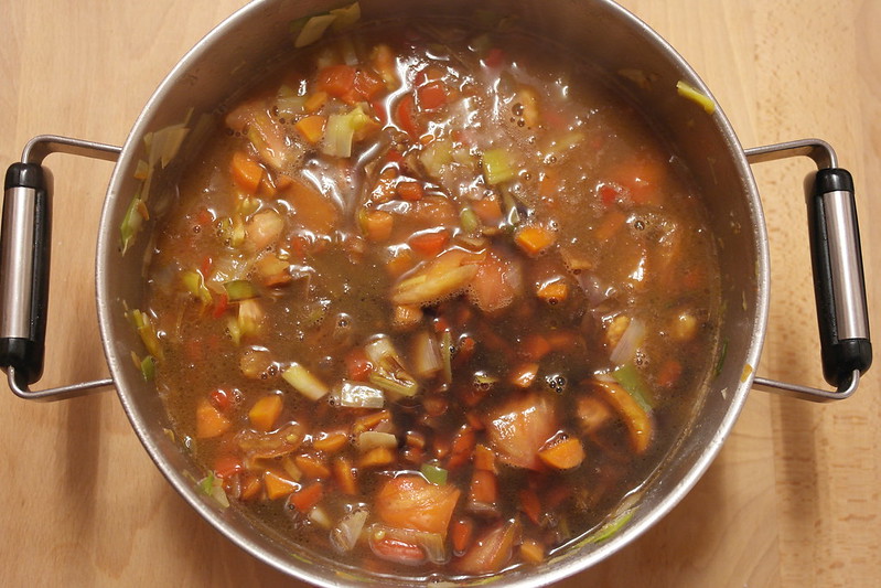 - Añadimos a la cazuela el puerro troceado, las hojas de laurel y las ramas de tomillo y dejamos que se pochen las verduras durante 10 minutos más.