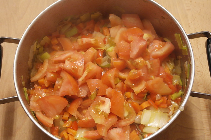 - Pelamos los tomates y los incorporamos al sofrito en trozos pequeños y salamos. Dejamos que se cocinen las verduras durante 15 minutos.
